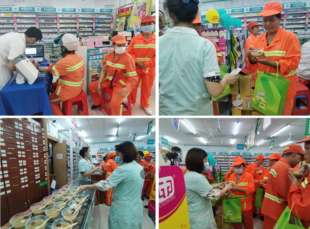下午,桂中大藥房箭盤店,柳南區其余環衛站的環衛工人在桂中大藥房箭盤店店長的組織下有序領取王老吉準備的由廣東涼茶顆粒、枇杷糖等組成的清涼解暑禮包,現場桂中大藥房店員還組織環衛工人測量血壓和血糖,為有健康疑問的環衛工人解答一些日常遇到的身體疾病問題。