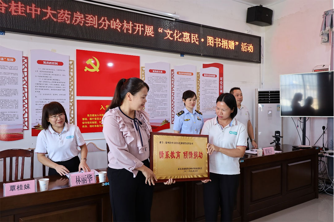 在“文化惠民·圖書捐贈”活動中,市市場監管局聯合桂中大藥房向分嶺村委捐贈圖書約100本,內容涵蓋政治、文學、歷史、醫藥衛生、教育等方面,為促進鄉村文化振興提供了精神糧食,豐富了廣大村民群眾的精神文化生活。
