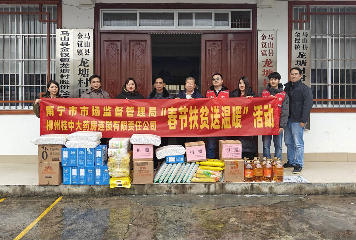 新春將至,歲寒送暖。為加大關愛力度,切實把溫暖送到脫貧戶的心坎上,鞏固脫貧成果,1月30日,南寧市場監督管理局攜手柳州桂中大藥房連鎖有限責任公司開展馬山縣龍塘村“春節扶貧送溫暖”活動,為群眾送上慰問品及新春祝福。